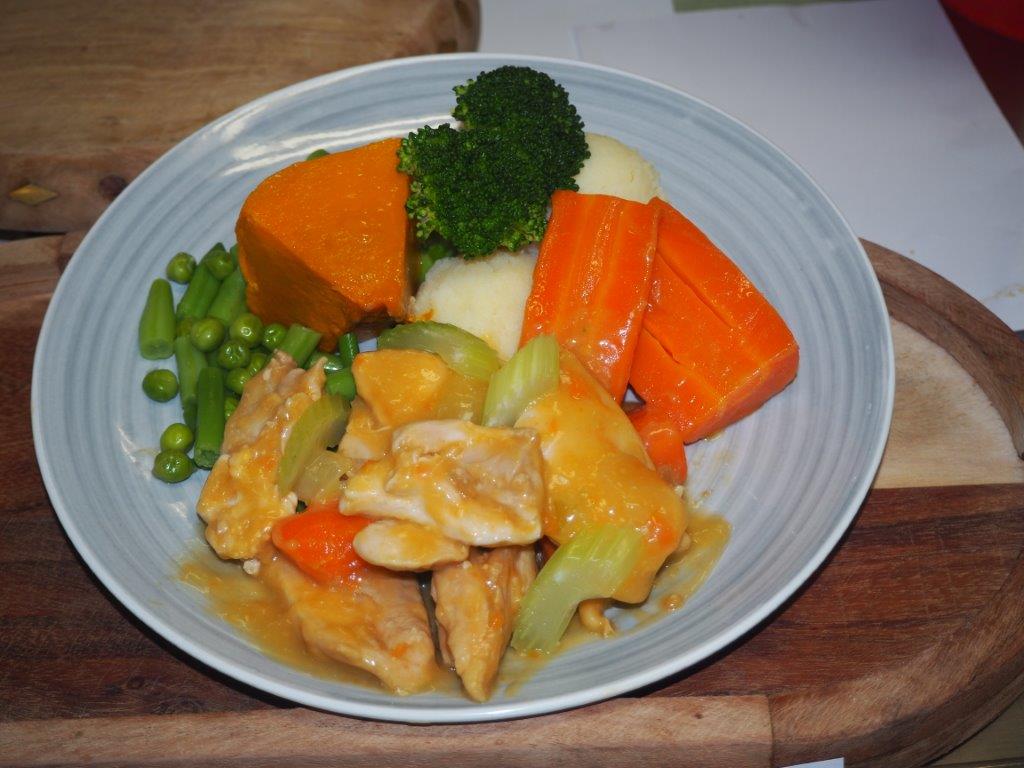 A slow-cooked chicken casserole full of vegetables, served on mashed potatoes