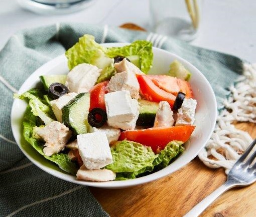 Fresh Cos lettuce topped with tomato, cucumber, black olives, feta cheese and tender Chicken