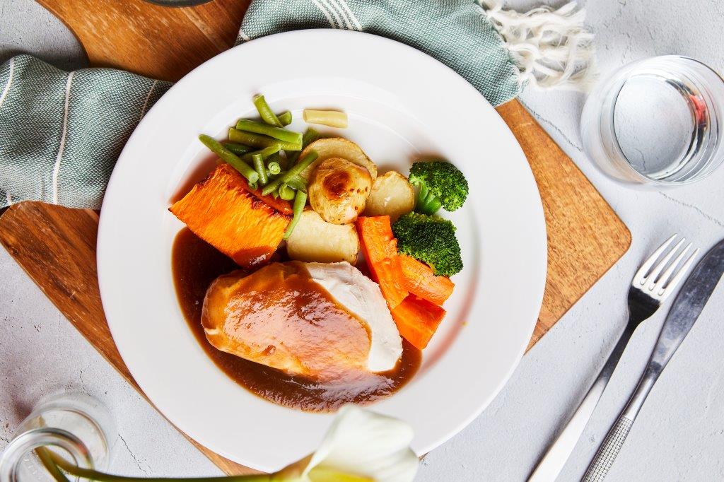 Tender chicken breast served with roast potatoes, fresh vegetables and gravy.