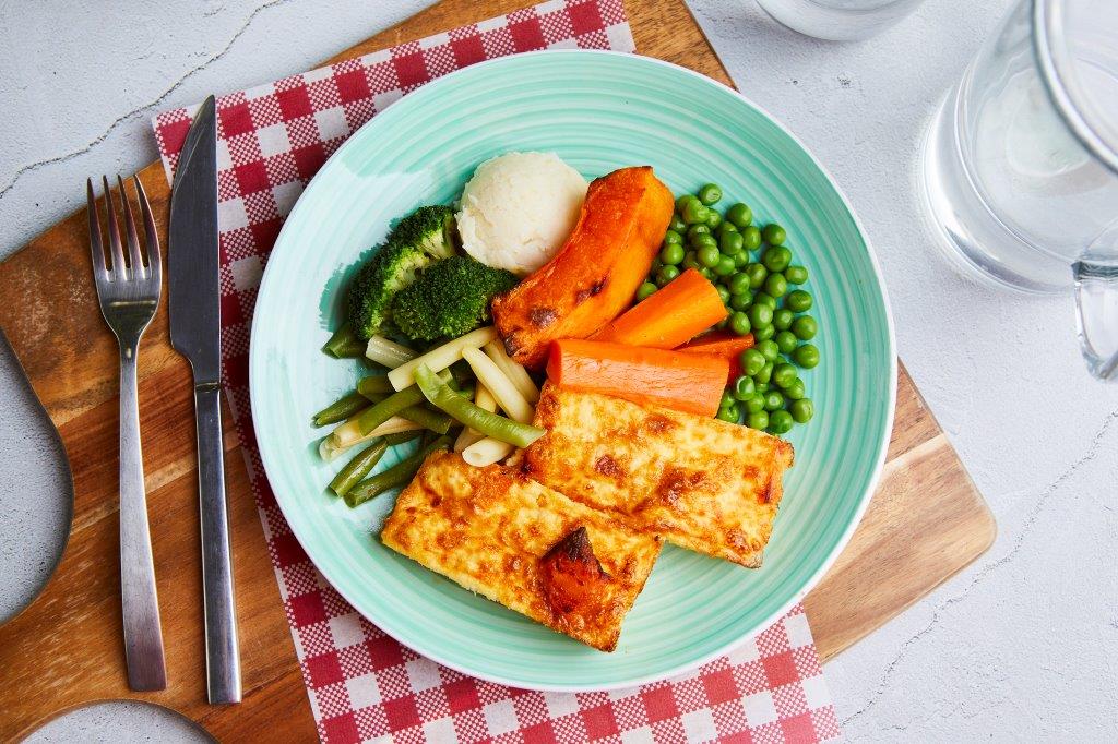Roast pumpkin baked with egg and served with fresh vegetables.