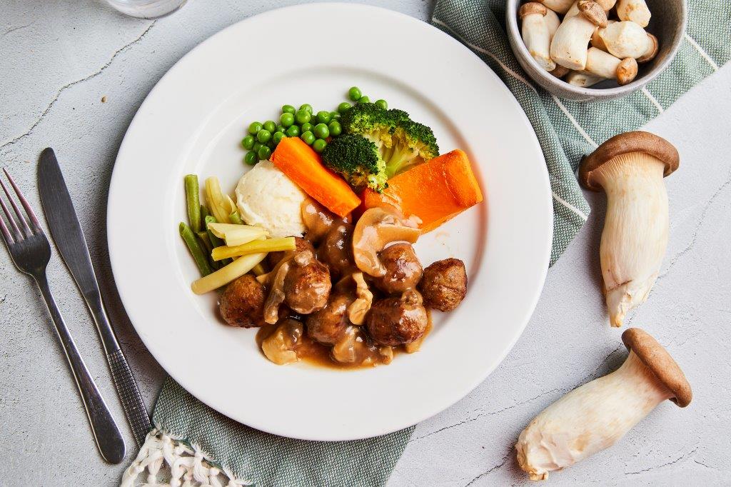 Beef Meatballs in a Mushroom sauce, served with fresh vegetables.