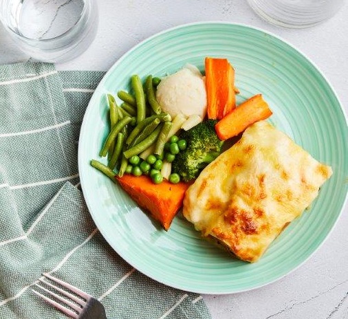 Zucchini and pumpkin layered with fresh pasta and bechamel sauce topped with cheese and served with vegetables.